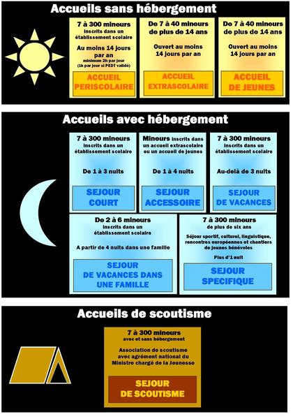 Les ACM sont régis par le Code de l’Action Sociale et des Familles (CASF), articles L 227-1 à L 227-12 et R 227-1 à R 227-30. Il existe trois grandes catégories d’accueils : avec hébergement, sans hébergement et scoutisme.